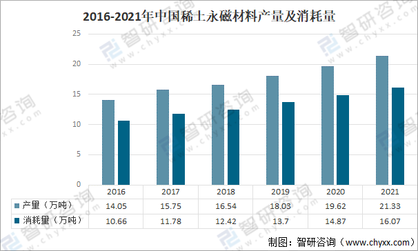稀土永磁材料是現在已知的綜合性能最高的一種永磁材料,它比九十世紀使用的磁鋼的磁性能高100多倍,比鐵氧體、鋁鎳鈷性能優越得多,比昂貴的鉑鈷合金的磁性能還高一倍。2021年中國稀土永磁材料產量約為21.33萬噸,同比增長8.7%;稀土永磁材料消耗量約為16.07萬噸,同比增長8.1%。