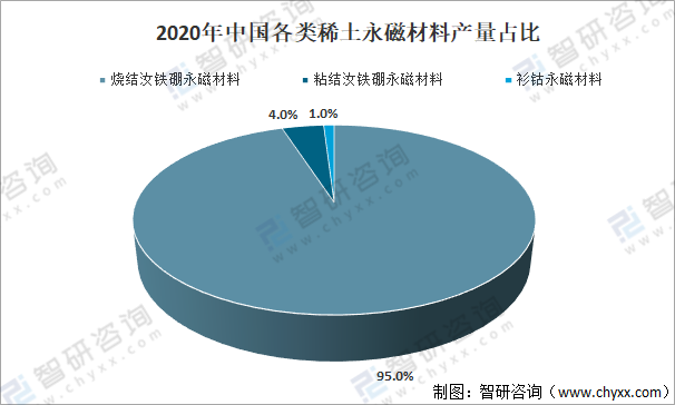 稀土永磁材料不僅促進了永磁器件向小型化發展,提高了產品的性能,而且促使某些特殊器件的產生。其中2020年中國燒結汝鐵硼永磁材料產量占比95%;粘結汝鐵硼永磁材料產量為4%。