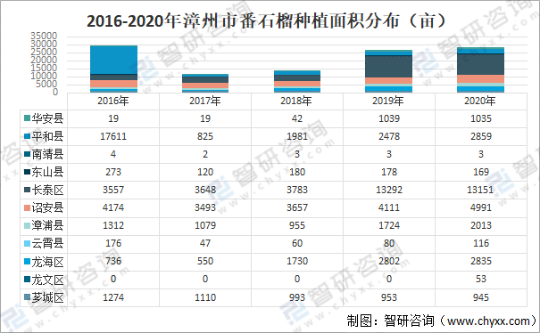 2016-2020年漳州市番石榴種植面積分布(畝)