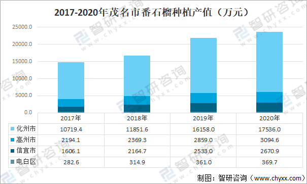 其中化州市占比最大,2020年實(shí)現(xiàn)產(chǎn)值17536萬(wàn)元;其次電白區(qū)番石榴種植產(chǎn)值為369.7萬(wàn)元;信宜市番石榴種植產(chǎn)值為2670.9萬(wàn)元;高州市番石榴種植產(chǎn)值為3094.6萬(wàn)元。