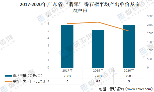 2017-2020年廣東省‘翡翠’番石榴平均產(chǎn)出單價(jià)及畝均產(chǎn)量
