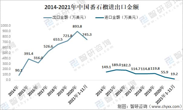 2014-2021年中國(guó)番石榴進(jìn)出口金額