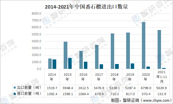近年來(lái),隨著中國(guó)本土番石榴產(chǎn)量的增長(zhǎng),中國(guó)番石榴進(jìn)口數(shù)量不斷下滑,由2015年的1599.1噸下降至2020年的370.4萬(wàn)噸,2021年前11月累計(jì)進(jìn)口量?jī)H為132.9噸;出口量則與之相反,逐年增加,2020年出口量達(dá)6799.0噸,2021年前11月累計(jì)出口量為5629.9噸。