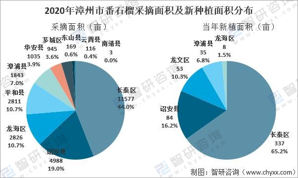 從采摘面積分布來(lái)看,2020年長(zhǎng)泰區(qū)占比44.0%,詔安縣占比19.0%,龍海區(qū)、平和縣均占比10.7%;從當(dāng)年新增面積來(lái)看,長(zhǎng)泰區(qū)占比65.2%,詔安縣占比16.2%,龍文區(qū)占比10.3%。