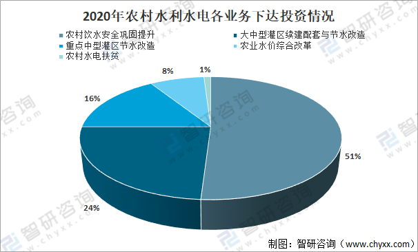 其中,農村飲水安全鞏固提升投資219.26億元,占比51%;大中型灌區續建配套與節水改造投資101.26億元,占比24%;重點中型灌區節水改造投資69.91億元,占比16%;農業水價綜合改革投資32.9億元,占比8%;農村水電扶貧投資5.23億元,占比1%。