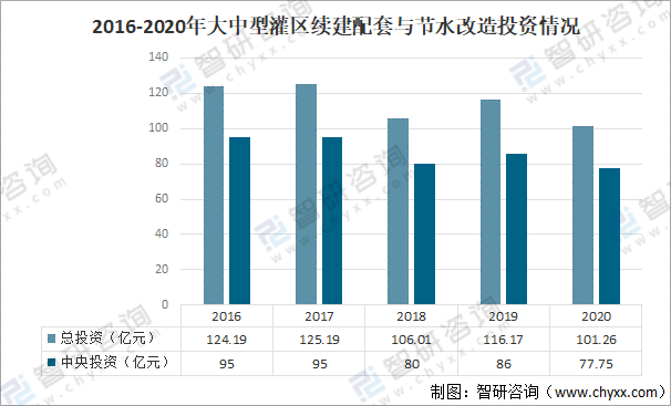 2016-2020年實際累計安排329處大型灌區和南疆52處重點中型灌區,總投資572.82億元,其中中央投資433.75億元。2020年,中型灌區續建配套節水改造項目中央預算內投資計劃101.26億元,其中中央投資77.75億元。