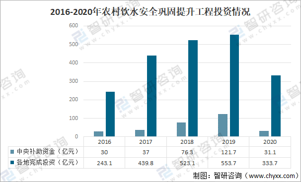 2016-2020年中央共下達農村飲水安全鞏固提升工程建設補助資金296.1億元,重點對貧困地區等予以適當補助,帶動各地(除北京、天津、上海外)完成工程建設投資2093.4億元;2020年,中央下達農村飲水安全鞏固提升工程建設補助資金31.1億元,各地共完成工程建設投資333.7億元。