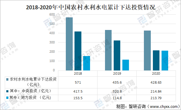 2020年,中國農村水利水電累計下達投資428.63億元,其中中央投資214.84億元,地方投資213.79億元。
