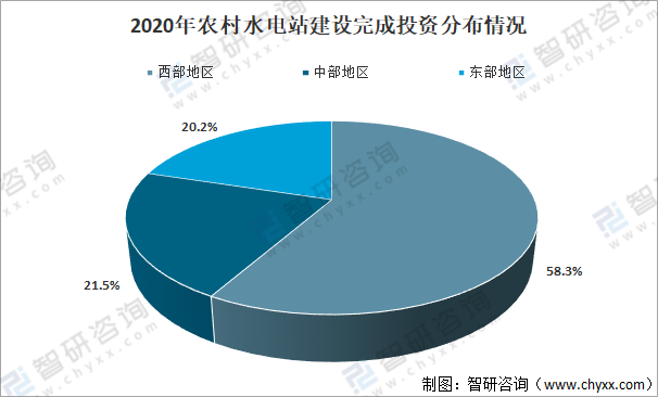 2020年,全國農村水電站建設完成投資58.6億元,其中東部11.8億元,占20.2%;中部12.6億元,占21.5%;西部34.1億元,占58.3%。