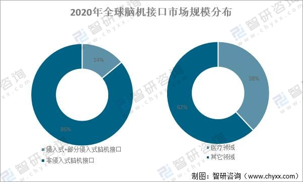 2020年,全球非侵入式腦機接口占腦機接口市場規(guī)模的86%,侵入式+部分侵入式腦機接口占14%;腦機接口在醫(yī)療領域的市場規(guī)模占比達62%,主要為腦機接口在醫(yī)療器械上的應用,其它領域占了62%。