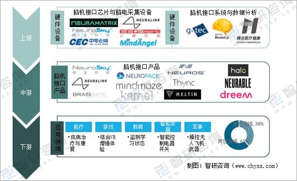 腦機接口產(chǎn)業(yè)鏈包括上游的腦機接口芯片和腦電采集設備廠商、操作系統(tǒng)和軟件提供商、數(shù)據(jù)分析服務商,中游的腦機接口產(chǎn)品提供商,以及下游包括醫(yī)療、教育、游戲、智能家居、軍事等應用領域。