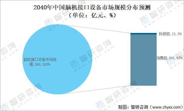 2040年中國腦機接口設備市場規(guī)模分布預測(單位:億元、%)