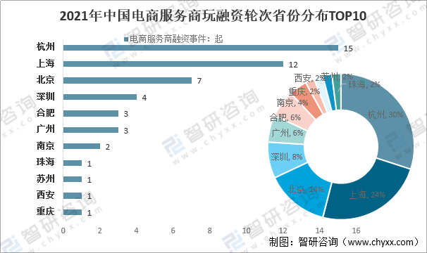 2021年中國電商服務商玩融資輪次省份分布TOP10