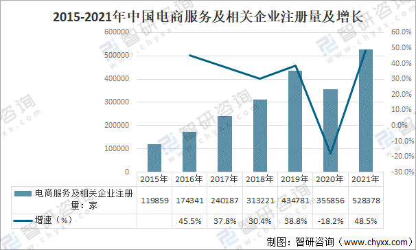 近些年來,電商一路狂奔,發展成為各行各業線上銷售主要渠道,隨著電商的迅猛發展,眾多的電商服務商紛紛涌現,為電商企業和從業者提供各種各樣的服務,2021年中國電商服務及相關企業注冊量528378家,同比增長48.5%。