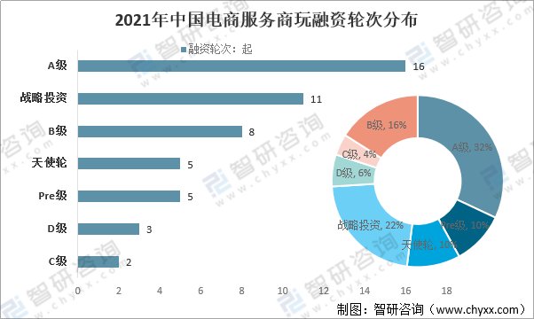 2021年中國電商服務商玩融資輪次分布上,A級16起、Pre級5起、天使輪5起、戰略投資11起、D級3起、C級2起、B級8起,分別占32%、10%、10%、22%、6%、4%、16%。