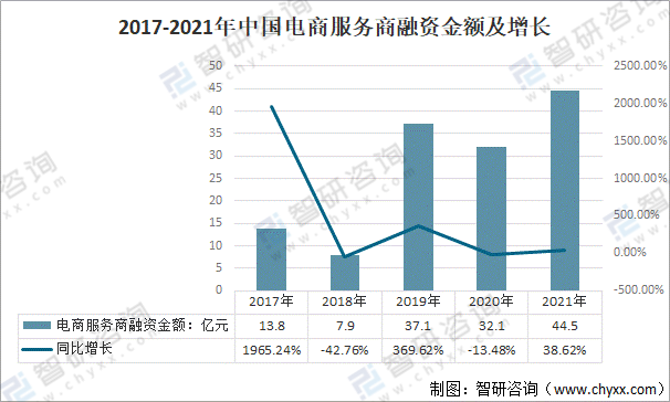 2017-2021年中國電商服務商融資金額及增長