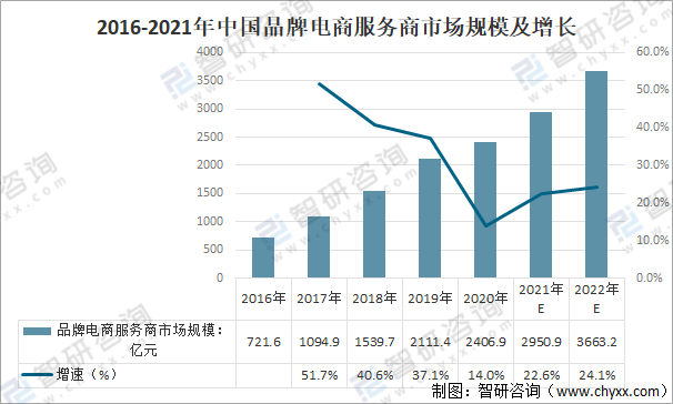 2016-2021年中國品牌電商服務商市場規模及增長