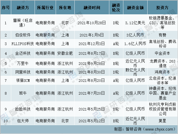 2021年中國電商服務商50起融資事件中,融資額排名前十的為:慧策(旺店通)(3.12億美元)、伯俊軟件(3億人民幣)、FLIPOS科技(1.6億人民幣)、企邁科技(億級人民幣)、萬里牛(近億人民幣)、網營科技(數億元人民幣)、領貓SCM(億級人民幣)、班牛(億級人民幣)、臉臉科技(億級人民幣)、包大師(近億人民幣)。