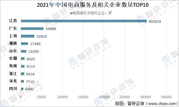 從中國電商服務及相關企業省市分布來看,2021年中國電商服務及相關企業最多的是江蘇,有電商服務及相關企業302619家,位居全國第一;第二是廣東,有電商服務及相關企業54689家;第二是上海,有電商服務及相關企業32925家。