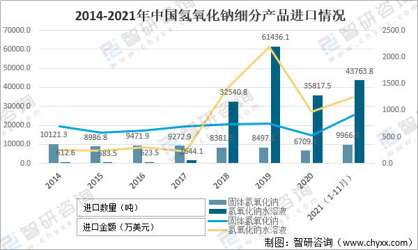 從細分產品來看,2021年1-11月中國固體氫氧化鈉進口數量為9966.3噸,進口金額為902.4萬美元;氫氧化鈉水溶液進口數量為43763.8噸,進口金額為1239.1萬美元。