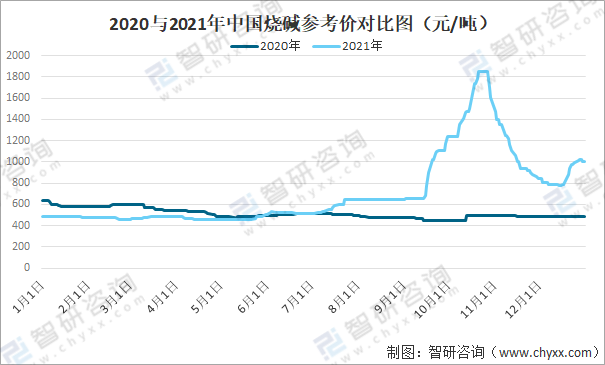 2020與2021年中國燒堿參考價對比圖(元/噸)