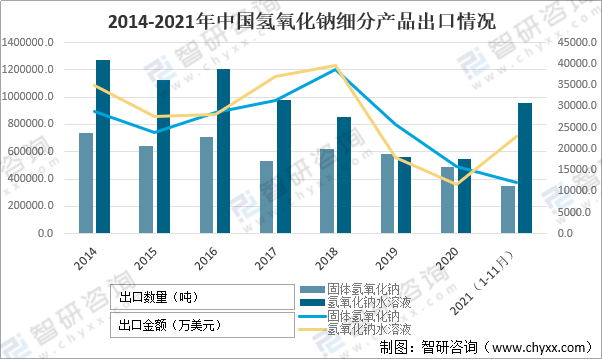 2014-2021年中國氫氧化鈉細分產品出口情況