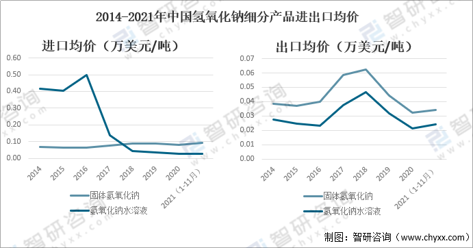 2014-2021年中國氫氧化鈉細分產品進出口均價