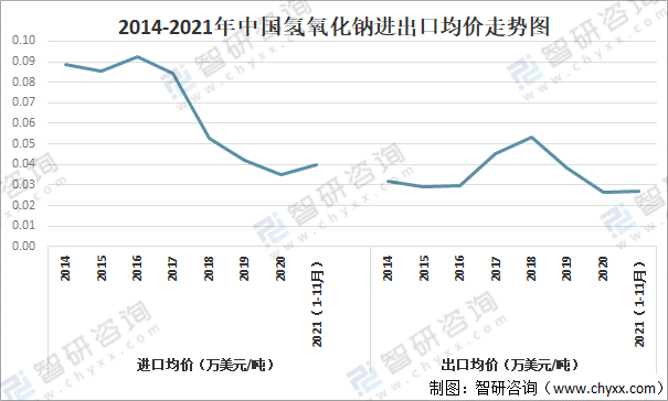 2014-2021年中國氫氧化鈉進出口均價走勢圖