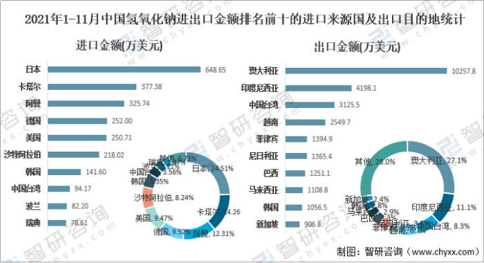 2021年1-11月中國氫氧化鈉進出口金額排名前十的進口來源國及出口目的地統計