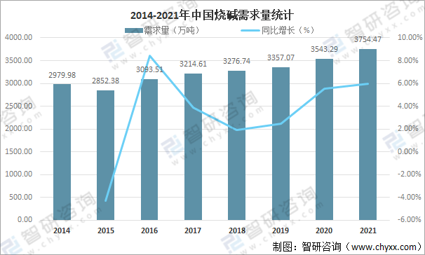 中國燒堿下游消費主要集中在冶金行業的氧化鋁生產、化工行業的無機鹽、有機化工、農藥、氯堿生產,紡織行業的印染、粘膠纖維生產,輕工行業的造紙等領域,其中氧化鋁行業是燒堿下游最大的用戶,而建筑業、交通業又是鋁的兩大消費領域,近年來在穩步推進新型城鎮化的拉動下,中國燒堿終端產品市場需求仍將保持較快增長,2021年中國燒堿需求量達3754.47萬噸,較2020年增加了211.2萬噸,同比增長5.96%,中國燒堿產量大于需求量,部分產品主要用于出口。