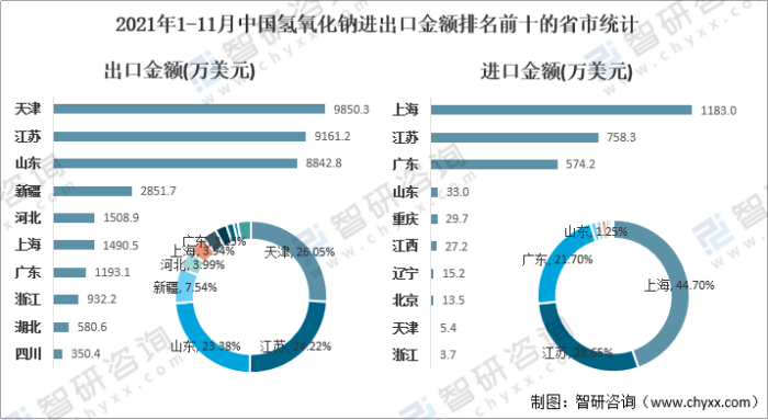 2021年1-11月中國氫氧化鈉進出口金額排名前十的省市統計