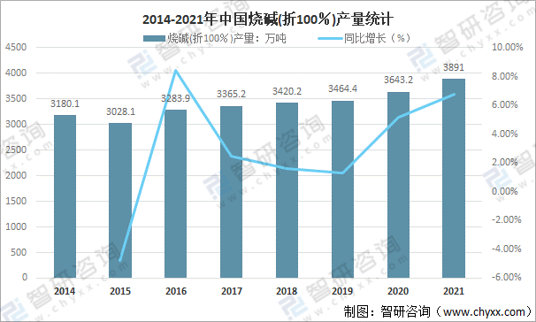 近年來,受到經濟形勢、下游產業需求量、新增產能數量、市場景氣程度、堿氯平衡制約等因素的影響,燒堿產量呈現出持續增長的形勢,2021年中國燒堿(折100%)產量達3891萬噸,較2020年增加了247.8萬噸,同比增長6.80%。
