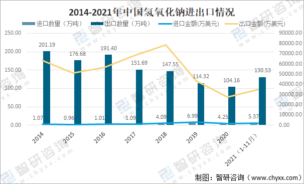 中國氫氧化鈉出口數量明顯大于進口數量,中國是全球氫氧化鈉重要的出口國之一,2021年1-11月中國氫氧化鈉進口數量為5.37萬噸,進口金額為2141.47萬美元;出口數量為130.53萬噸,出口金額為34946.75萬美元。