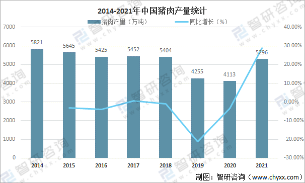 隨著中國生豬出欄量的增加,豬肉產量也隨之增長,2021年中國豬肉產量達5296萬噸,較2020年增加了1183萬噸,同比增長28.76%,目前,豬肉是我國居民第一大消費肉類。