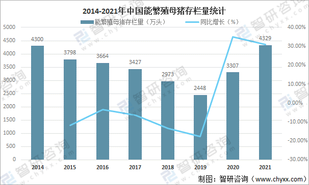 其中,2021年中國能繁殖母豬存欄量達4329萬頭,較2020年增加了1022萬頭,同比增長30.90%。
