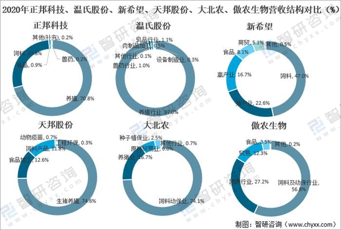 2020年正邦科技、溫氏股份、新希望、天邦股份、大北農、傲農生物營收結構對比(%)