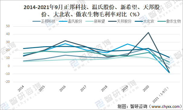 2014-2021年9月正邦科技、溫氏股份、新希望、天邦股份、大北農、傲農生物毛利率對比(%)