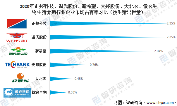 2020年正邦科技、溫氏股份、新希望、天邦股份、大北農、傲農生物生豬養殖行業企業市場占有率對比(按生豬出欄量)