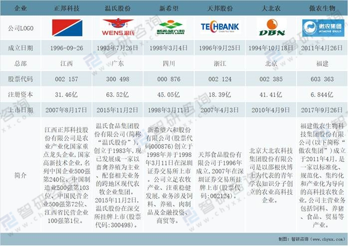 經過多年的發展,中國生豬養殖企業遍地開花,一大批優秀的生豬養殖企業迅速崛起,逐漸成為生豬養殖行業中的翹楚,如正邦科技、溫氏股份、新希望、天邦股份、大北農、傲農生物等,從成立時間來看,溫氏股份成立日期要早于正邦科技、新希望、天邦股份、大北農和傲農生物,從上市時間來看,天邦股份上市時間要早于正邦科技、溫氏股份、新希望、大北農和傲農生物,正邦科技總部在江西,溫氏股份總部在廣東,新希望總部在四川,天邦股份總部在浙江,大北農總部在北京,傲農生物總部在福建。