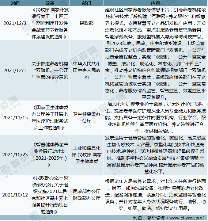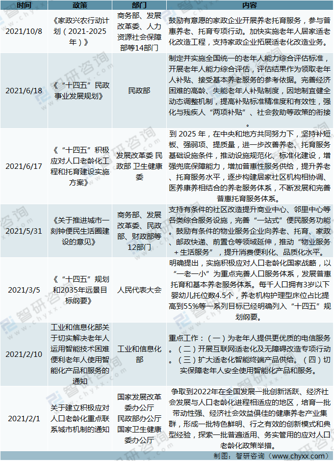 2021年中央和地方政府持續(xù)出臺各類養(yǎng)老相關(guān)政策,一方面,鼓勵(lì)和推動(dòng)養(yǎng)老產(chǎn)業(yè)建設(shè),從國家戰(zhàn)略高度推動(dòng)養(yǎng)老事業(yè)和養(yǎng)老產(chǎn)業(yè)的協(xié)同發(fā)展;另一方面,政策愈發(fā)細(xì)化,聚焦養(yǎng)老服務(wù)體系和行業(yè)發(fā)展目標(biāo)。
