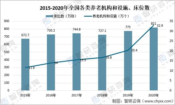 據(jù)民政部數(shù)據(jù)統(tǒng)計(jì),截至2020年底,全國共有各類養(yǎng)老機(jī)構(gòu)和設(shè)施32.9萬個(gè),較上年增加12.5萬個(gè),同比增長61.27%;養(yǎng)老床位合計(jì) 821.0 萬張,較上年增加46萬張,同比增長5.94%。
