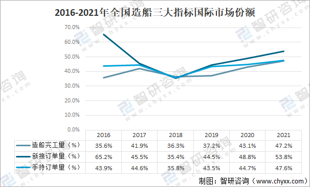 2016-2021年全國造船三大指標國際市場份額