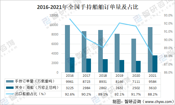 2016-2021年全國手持船舶訂單量及占比