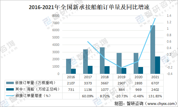 2016-2021年全國新承接船舶訂單量及同比增速