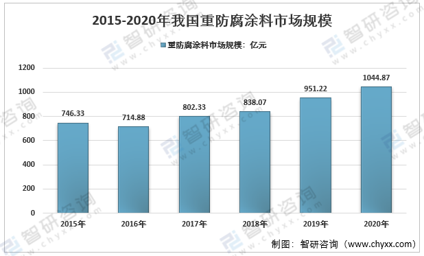 近年來,我國重防腐涂料行業在經濟高速發展的推動下,進入了高速成長的黃金期,成為涂料行業中發展較快、與國際接觸較早、市場附加值高的涂料。根據智研咨詢發布的《2022-2028年中國重防腐涂料行業市場行情動態及投資前景分析報告》顯示,2020年我國重防腐涂料市場規模1044.87億元,同比2019年的951.22億元增長了9.85%,近幾年我國重防腐涂料市場規模情況如下圖所示: