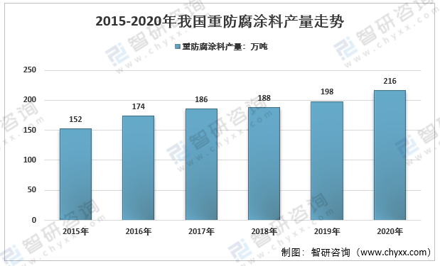 2015-2020年我國重防腐涂料產量走勢
