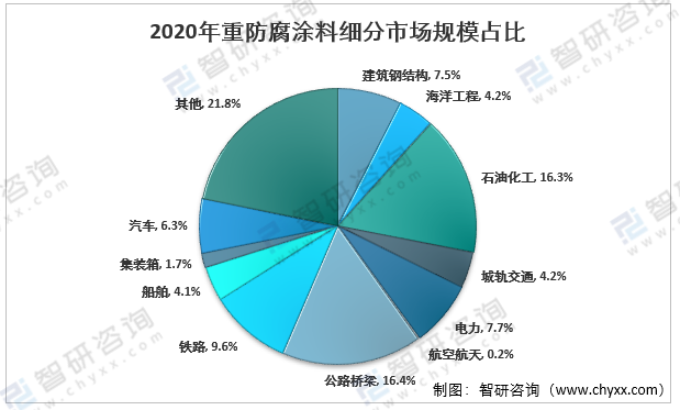 2020年,在重防腐涂料下游細分市場中,規模較大的有公路橋梁行業(16.4%)、石油化工行業(16.3%)、鐵路行業(9.6%)等。
