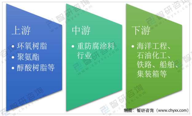 重防腐涂料是指相對常規防腐涂料而言,能在相對苛刻腐蝕環境里應用,并具有能達到比常規防腐涂料更長保護期的一類防腐涂料。重防腐涂料行業產業鏈上游包括環氧樹脂、聚氨酯、醇酸樹脂等,下游廣泛應用于海洋工程、石油化工、鐵路、船舶、集裝箱等領域。