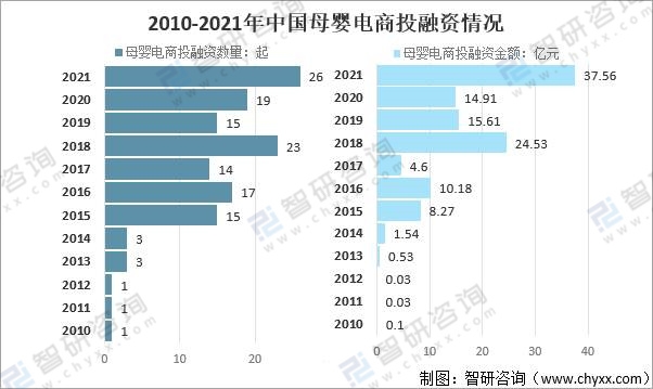 目前中國母嬰市場需求群體呈現增長快,存量大的特點,母嬰行業迎來更加快速的發展。2015年互聯網+引爆母嬰行業,母嬰電商投融資數量15起,投融資金額8.27億元;2016年中國母嬰電商投融資數量17起,投融資金額10.18億元;在2017年出現小幅下降后,2018年母嬰電商又迎來融資熱,母嬰電商投融資數量23起,投融資金額24.53億元;在經過2019年、2020年連續兩年的下降之后2021年中國母嬰電商投融資達到高潮,母嬰電商投融資數量26起,投融資金額37.56億元,母嬰電商投融資數量及金額均創歷史新高。