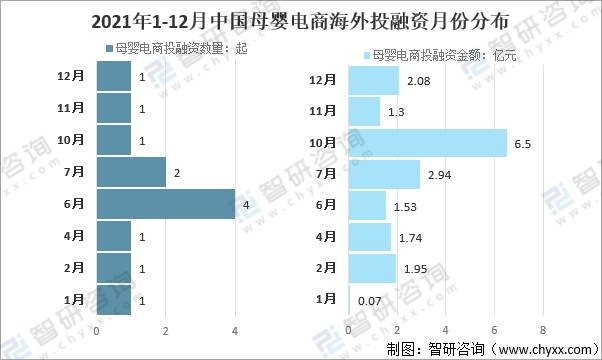 從中國母嬰電商海外投融資月份分布來看,2021年1-12月,中國母嬰電商海外投融資次數最多的月份是6月,融資4起,融資金額僅為1.53億元;融資金額最多的是10月份,單筆融資獲得6.5億元。